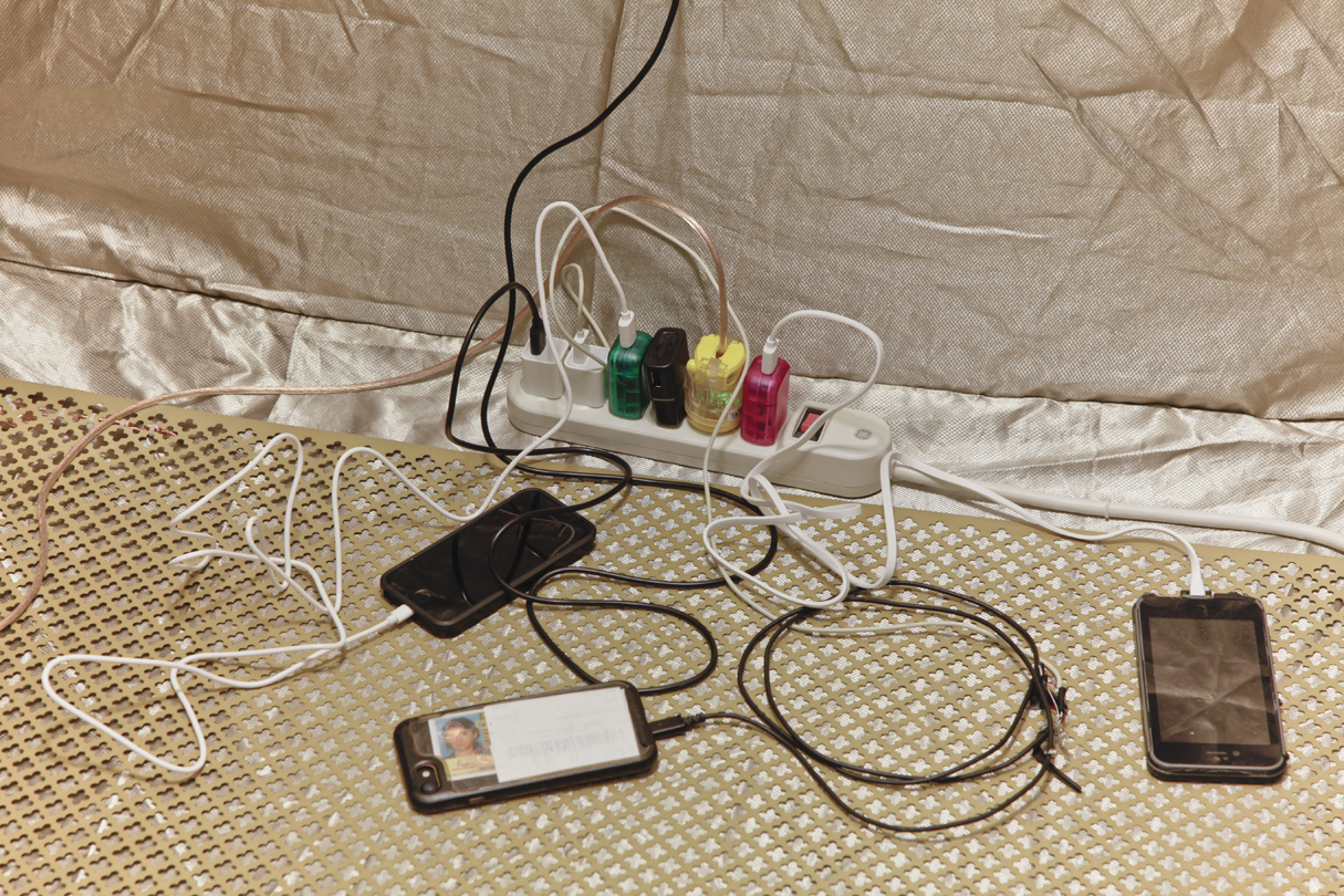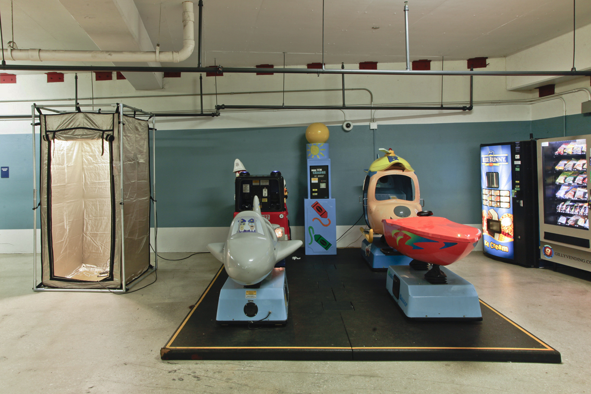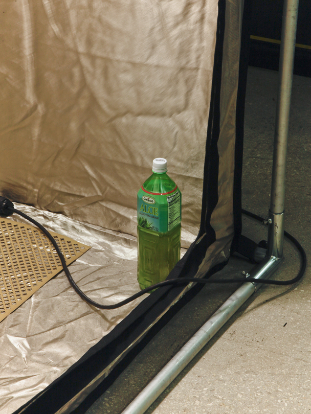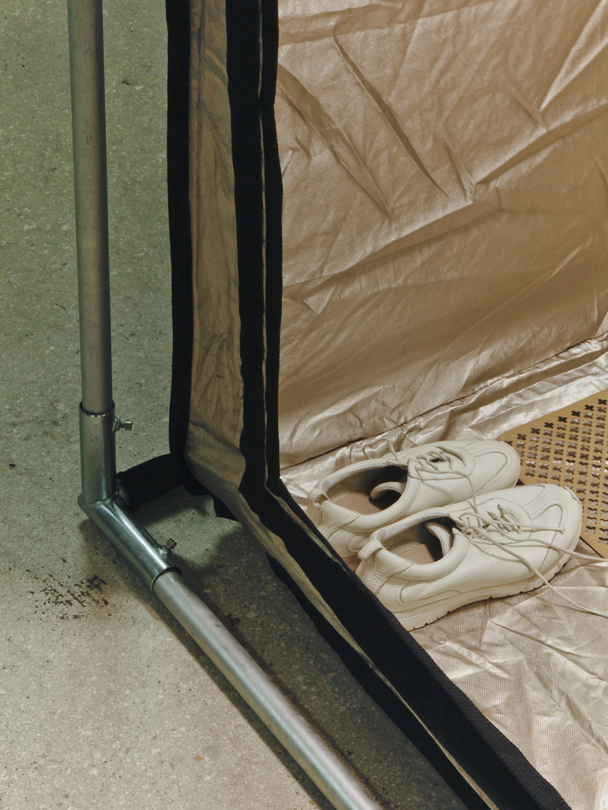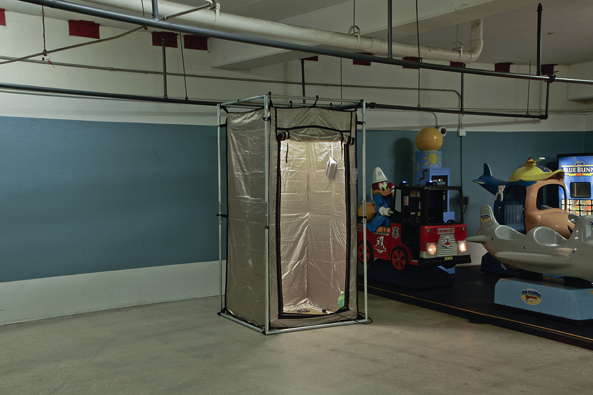 Safe and Charging StationEdward Shenk November 2017 EMI/RFI-shielding Faraday tent, grounded aluminum sheet (cloverleaf), HTC Droid Incredible 2, found video “crickets” on loop [0:56 sec, 2015, includes sample from Faeries (‘Dance of the Sugar Plum Fairy’ from Tchaikovsky’s Nutcracker Suite) by Mannheim Steamroller, as identified by Shazam app], rose quartz mezuzah case containing artist-signed psychiatric living will, hand-gilded book of poems by self-identifying T.I. Sharon Rose Poet, aloe drink bottle, urine, found shoes, rubber bands, plastic bag, magnets, power strip w/ assorted chargers available for use by viewers As part of Pretty Days: MIA In collaboration with BFI and Anna Frost Midtown Miami Parking Garage Miami, FL Documentation by Harry Gould Harvey IV |